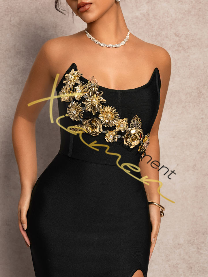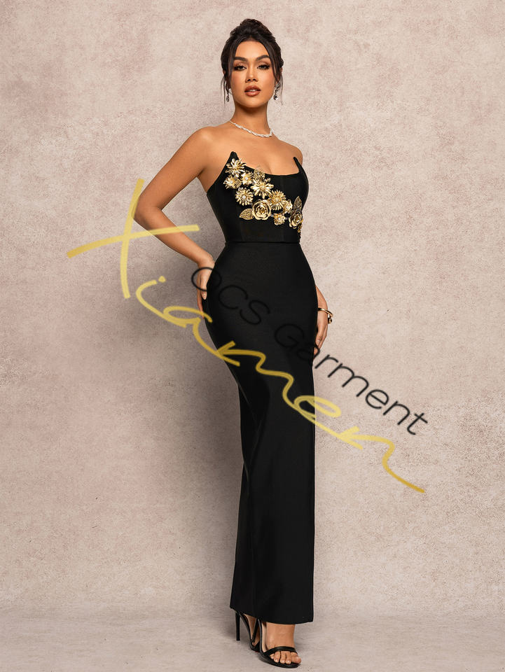 Ocstrade 2025 Summer Wear Off the Shoulder Metal Flower Black Bandage Dress Bulk Sales Hot Selling Women's Clothes Casual Dress