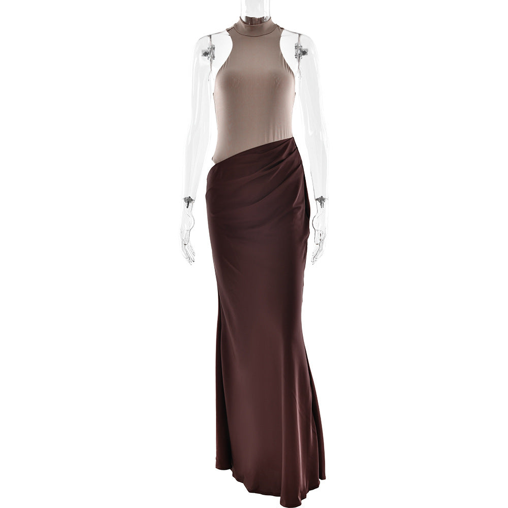 Este deslumbrante vestido comprido combina a sofisticação do cetim com um design moderno e ousado. Apresenta recortes estratégicos em patchwork, uma elegante gola alta e um design sem mangas que realça a silhueta. Ideal para festas, eventos noturnos ou graças especiais onde se quer destacar com elegância e estilo.