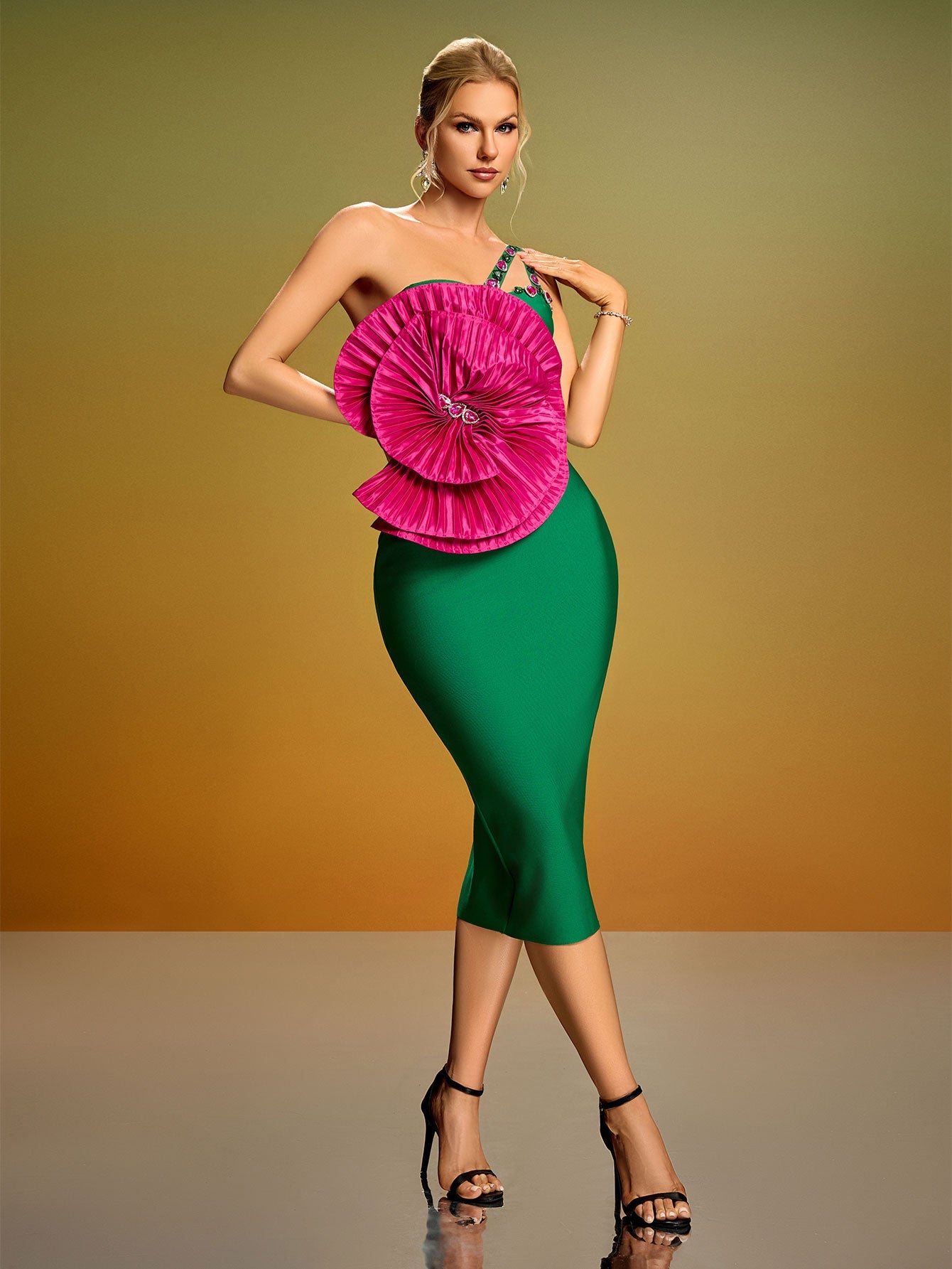 Os plissados delicados acrescentam movimento e suavidade, enquanto as aplicações florais com cristais iluminam o visual com um brilho subtil e sofisticado. O comprimento midi mantém o equilíbrio perfeito entre sensualidade e classe, tornando esta peça ideal para eventos formais, celebrações especiais ou jantares marcantes.