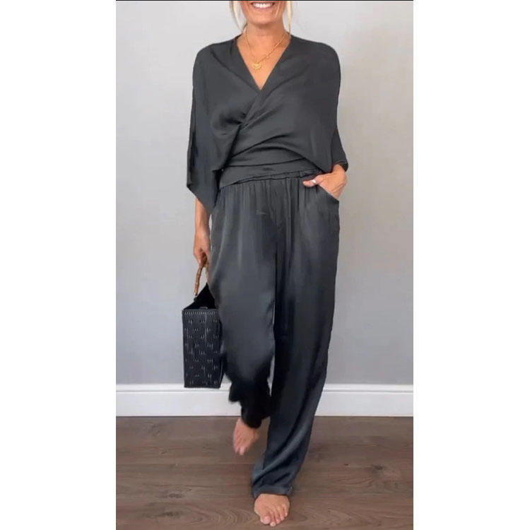 S-3XL Casual Satin Suit Custom logo V Neck Soft Top Wholesale Solid Color Trousers Factory Directly