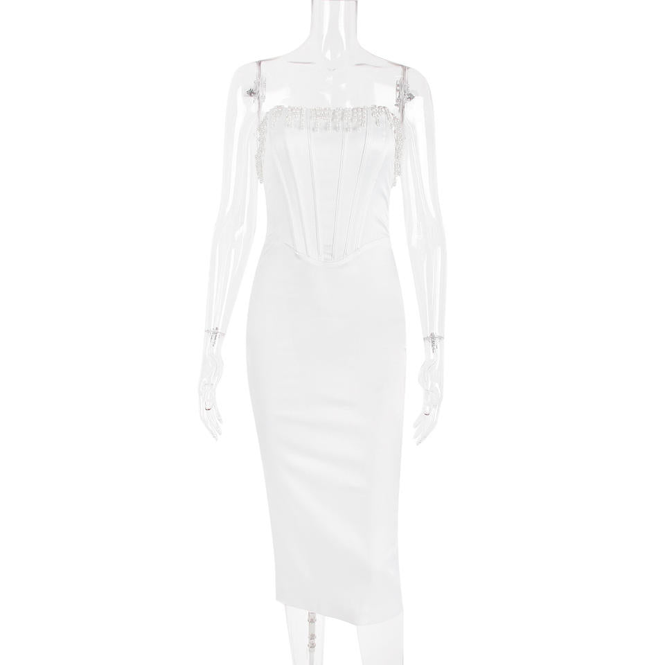 O Vestido Verena é a combinação ideal entre luxo discreto e sensualidade sofisticada. Com design tomara-que-caia estruturado por tecnologia fishbone, o modelo abraça o corpo de forma firme, elevando o busto e valorizando a silhueta de maneira impecável.