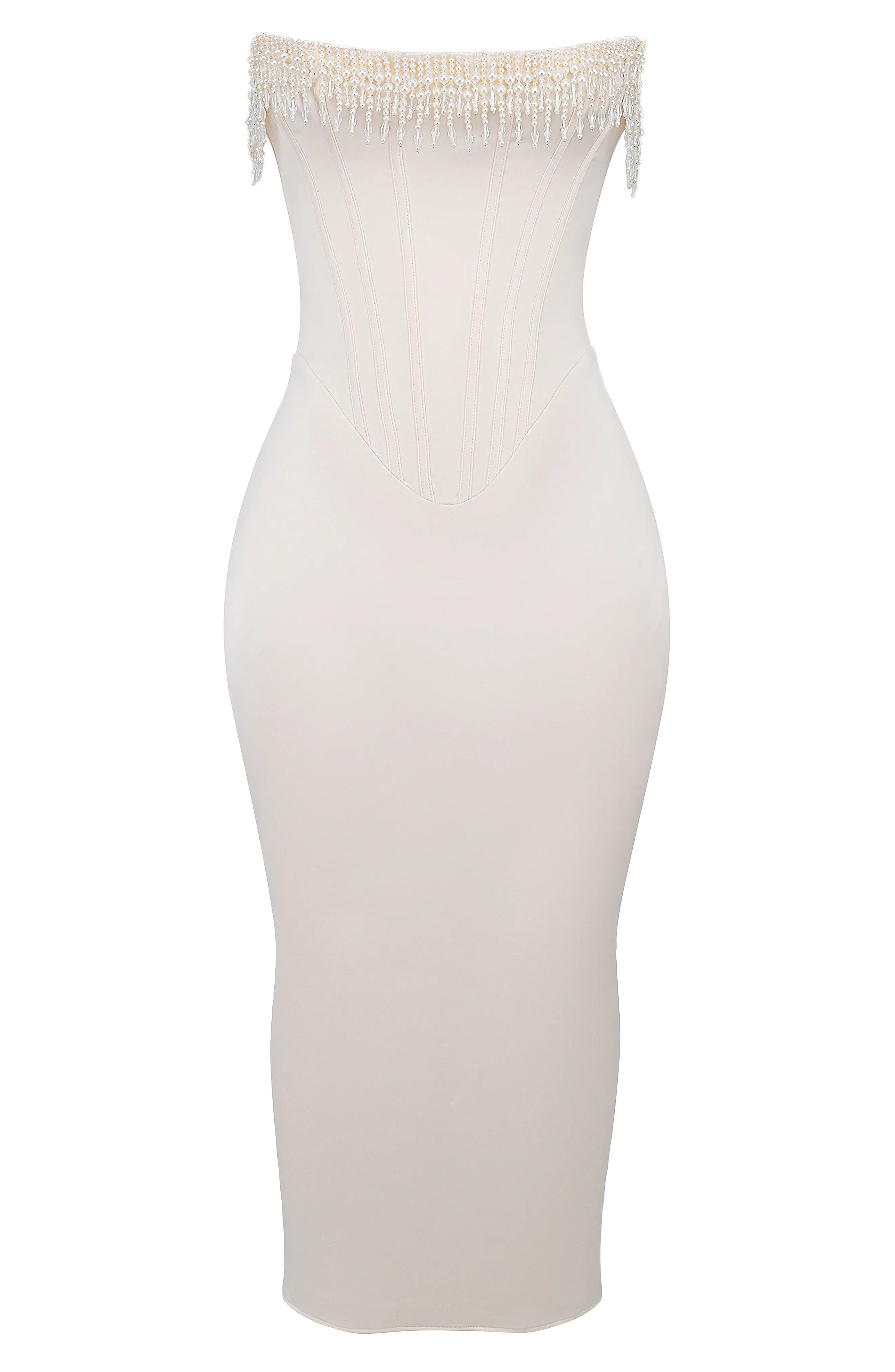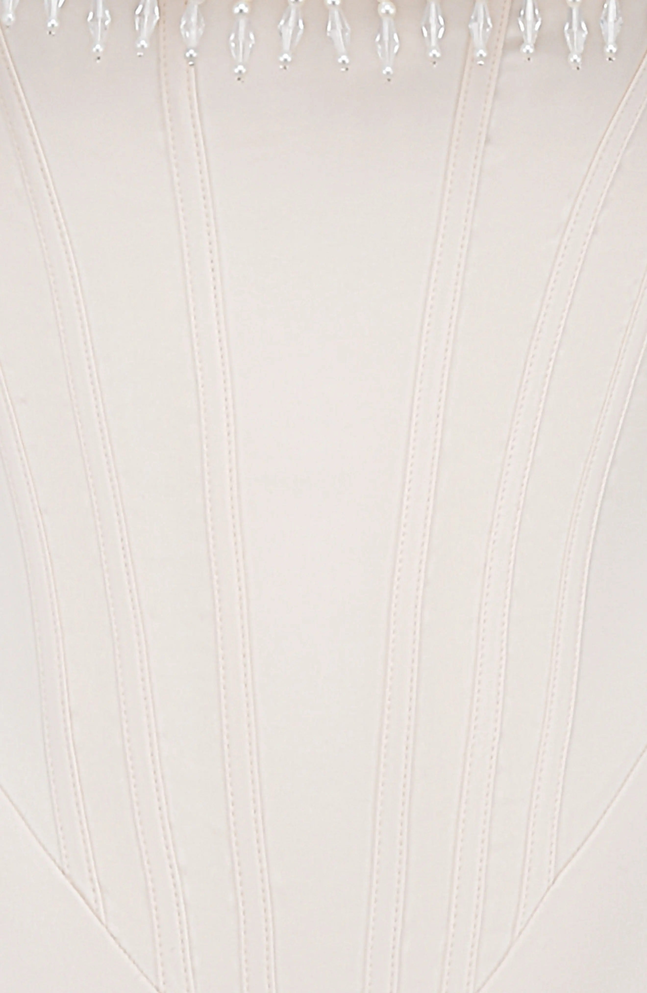 Os detalhes de franzidos delicados, zíper oculto e aplicações discretas em pérolas elevam o acabamento, conferindo-lhe um toque de requinte adicional.