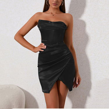 Este deslumbrante vestido mini combina sensualidade e sofisticação, perfeito para noites de clube ou eventos especiais. Com um design que realça o colo e detalhes drapeados, este vestido com forro em segurança e estrutura de barbatana realça a silhueta, garantindo um look inesquecível.